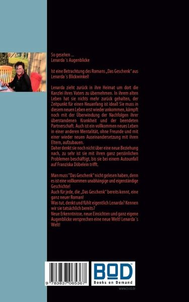 So gesehen ... Lenarda´s Augenblicke Ist eine Betrachtung des Romans "Das Geschenk" aus Lenarda´s Blickwinkel! Lenarda zieht zurück in ihre Heimat um dort die Kanzlei ihres Vaters zu übernehmen. In ihrem alten Leben hat sie nichts mehr zurück gehalten, der Zeitpunkt für einen Neuanfang ist ideal! Sie muss in diesem neuen Leben erst wieder ankommen, kämpft noch mit der Überwindung der Nachfolgen ihrer überstandenen Krankheit und der beendeten Partnerschaft. Auch ist ein vollkommen neues Leben in einer anderen Mentalität, ohne Freunde und mit einer wieder neuen Auseinandersetzung mit ihren Eltern, aufzubauen. Daher denkt sie noch nicht über eine neue Beziehung nach, zu sehr ist sie mit ihren ganz persönlichen Problemen beschäftigt, bis sie bei einem Autounfall auf Franziska Döbelein trifft. Man muss "Das Geschenk" noch nicht gelesen haben, denn es es ist ein völlig unabhängiger, neuer Roman! Aber auch für jede, die "Das Geschenk" bereits kennt, wird es eine ganz neue Geschichte! Was tut, denkt und fühlt eigentlich Lenarda? Kennen wir sie tatsächlich bereits? Neue Erkenntnisse, neue Einsichten und ganz eigene Augenblicke versprechen eine neue Welt! Lenarda´s Welt!