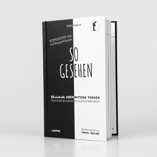 Wie kann man vom eigenen Standpunkt abrücken und die Welt mal mit etwas anderen Augen sehen? Dieses Buch hilft beim Perspektivwechsel, denn es betrachtet Vorurteile und viele alltägliche Dinge von zwei Seiten. Mal lustig, mal skurril, mal nachdenklich. Ein typisches Sorgenboy-Plädoyer gegen das Schwarz-Weiß-Denken. Mit wunderbaren Illustrationen von Meta Bene. Natürlich in schwarz/weiß.