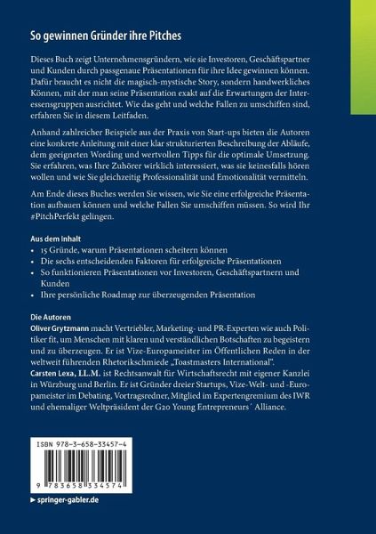 Dieses Buch zeigt Unternehmensgründern, wie sie Investoren, Geschäftspartner und Kunden durch passgenaue Präsentationen für ihre Idee gewinnen können. Dafür braucht es nicht die magisch-mystische Story, sondern handwerkliches Können, mit der man seine Präsentation exakt auf die Erwartungen der Interessensgruppen ausrichtet. Wie das geht und welche Fallen zu umschiffen sind, erfahren Sie in diesem Leitfaden.Anhand zahlreicher Beispiele aus der Praxis von Start-ups bieten Carsten Lexa und Oliver Grytzmann eine konkrete Anleitung mit einer klar strukturierten Beschreibung der Abläufe, dem geeigneten Wording und wertvollen Tipps für die optimale Umsetzung. Sie erfahren, was Ihre Zuhörer wirklich interessiert, was sie keinesfalls hören wollen und wie Sie gleichzeitig Professionalität und Emotionalität vermitteln. Am Ende dieses Buches werden Sie wissen, wie Sie eine erfolgreiche Präsentation aufbauen können und welche Fallen Sie umschiffen müssen. So wird Ihr#PitchPerfekt gelingen. Aus dem Inhalt15 Gründe, warum Präsentationen scheitern könnenDie sechs entscheidenden Faktoren für erfolgreiche PräsentationenSo funktionieren Präsentationen vor Investoren, Geschäftspartnern und KundenIhre persönliche Roadmap zur überzeugenden Präsentation