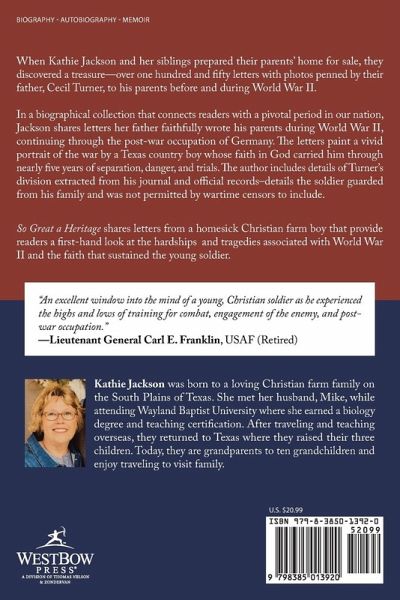When Kathie Jackson and her siblings prepared their parents' home for sale, they discovered a treasure-over one hundred and fifty letters with photos penned by their father, Cecil Turner, to his parents before and during World War II. In a biographical collection that connects readers with a pivotal period in our nation, Jackson shares letters her father faithfully wrote his parents during World War II, continuing through the post-war occupation of Germany. The letters paint a vivid portrait of the war by a Texas country boy whose faith in God carried him through nearly five years of separation, danger, and trials. The author includes details of Turner's division extracted from his journal and official records-details the soldier guarded from his family and was not permitted by wartime censors to include. So Great a Heritage shares letters from a homesick Christian farm boy that provide readers a first-hand look at the hardships and tragedies associated with World War II and the faith that sustained the young soldier. "An excellent window into the mind of a young, Christian soldier as he experienced the highs and lows of training for combat, engagement of the enemy, and post-war occupation." -Lieutenant General Carl E. Franklin, USAF (Retired)