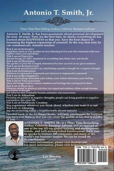 Antonio T. Smith Jr., has been passionate about personal development for over 30 years. Now, for the first time, he shares everything he has learned about HAPPINESS so that you have the best chance of becoming the highest expression of yourself. In the way that only he can communicate, Antonio teaches: THE LAW OF INTEGRITY Happiness arises as a by-product of your choosing to live your life consistent with your highest values and aspirations THE LAW OF EMOTION Human beings are 100% emotional in everything they think, feel, and decide THE LAW OF HAPPINESS The quality of your life is largely determined by how you feel at any given moment THE LAW OF SUBSTITUTION You can keep yourself positive by substituting a positive thought for a negative thought THE LAW OF EXPRESSION Whatever is expressed is impressed and whatever is impressed is expressed THE LAW OF REVERSIBILITY Just as your feelings determine your actions, your actions determine your feelings THE LAW OF VISUALIZATION Ideas and images tend to awaken emotions and feelings that correspond to them THE LAW OF PRACTICE Whatever mental or physical activities you repeat and reinforce often enough become new habits of thought The LAW OF ATTRACTION Focusing on positive or negative thoughts, people can bring positive or negative experiences into your life. The LAW OF DELIBERATE CREATION You experience whatever you think about, whether you want it or not. The LAW OF ALLOWING You are co-creating within a magnificently diverse universe. This first book in the So Happy Series, will help you become the happiest you have ever been so that you can create the quality of life that is worthy of you