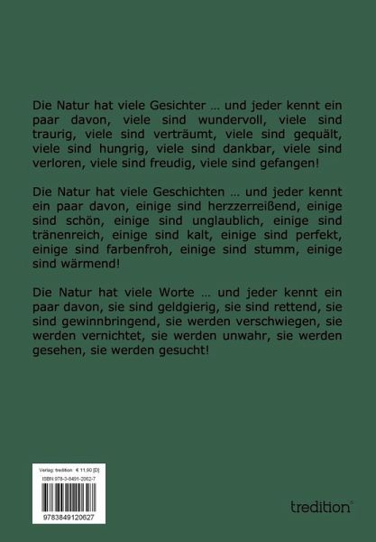Die Natur hat viele Gesichter und jeder kennt ein paar davon, viele sind wundervoll, viele sind traurig, viele sind verträumt, viele sind gequält, viele sind hungrig, viele sind dankbar, viele sind verloren, viele sind freudig, viele sind flehend, viele sind eingesperrt, viele sind wild, viele sind lautlos, viele sind verspielt, viele sind gefangen!Die Natur hat viele Geschichten und jeder kennt ein paar davon, einige sind herzzerreißend, einige sind schön, einige sind unglaublich, einige sind tränenreich, einige sind kalt, einige sind perfekt, einige sind farbenfroh, einige sind stumm, einige sind gefährlich, einige sind wärmend, einige sind wunschlos, einige sind verachtend!Die Natur hat viele Worte und jeder kennt ein paar davon, sie sind geldgierig, sie sind rettend, sie sind gewinnbringend, sie werden verschwiegen, sie werden vernichtet, sie werden getrieben, sie werden zerstört, sie werden unwahr, sie werden vergessen, sie werden verstanden, sie werden gesehen, sie werden gesucht!