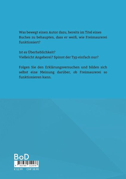 Was bewegt einen Autor dazu, bereits im Titel eines Buches zu behaupten, dass er weiß, wie Freimaurerei funktioniert? Ist es Überheblichkeit? Vielleicht Angeberei? Spinnt der Typ einfach nur? Folgen Sie den Erklärungsversuchen und bilden sich selbst eine Meinung darüber, ob Freimaurerei so funktionieren kann.