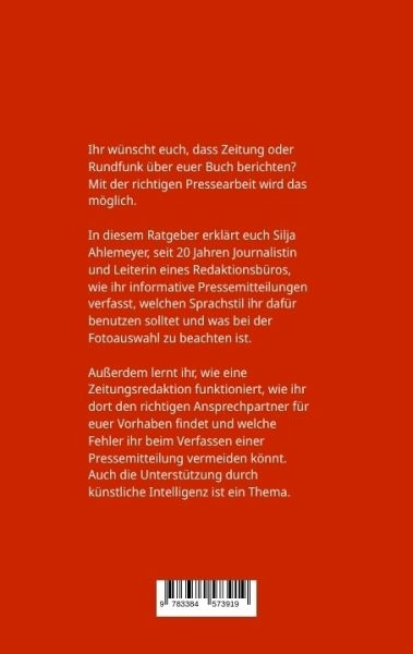 Ihr wünscht euch, das Zeitung oder Rundfunk über euer Buch berichten? Mit der richtigen Pressearbeit wird das möglich!In diesem Buch erklärt euch die Journalistin Silja Ahlemeyer, seit 20 Jahren Leiterin eines Redaktionsbüros, wie ihr informative Pressemitteilungen verfasst, welchen Sprachstil ihr dafür benutzen solltet und was bei der Fotoauswahl zu beachten ist. Außerdem erfahrt ihr, wie eine Zeitungsredaktion funktioniert, wie ihr dort den richtigen Ansprechpartner findet und welche Fehler ihr beim Verfassen einer Pressemitteilung vermeiden könnt. Auch die Unterstützung durch KI ist ein Thema.