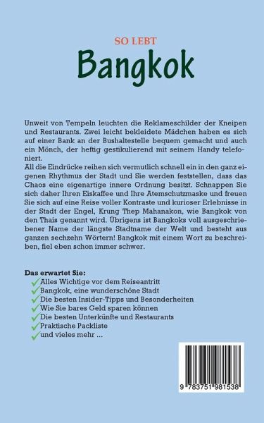 Unweit von Tempeln leuchten die Reklameschilder der Kneipen und Restaurants. Zwei leicht bekleidete Mädchen haben es sich auf einer Bank an der Bushaltestelle bequem gemacht und auch ein Mönch, der heftig gestikulierend mit seinem Handy telefoniert.All die Eindrücke reihen sich vermutlich schnell ein in den ganz eigenen Rhythmus der Stadt und Sie werden feststellen, dass das Chaos eine eigenartige innere Ordnung besitzt. Schnappen Sie sich daher Ihren Eiskaffee und Ihre Atemschutzmaske und freuen Sie sich auf eine Reise voller Kontraste und kurioser Erlebnisse in der Stadt der Engel, Krung Thep Mahanakon, wie Bangkok von den Thais genannt wird. Übrigens ist Bangkoks voll ausgeschriebener Name der längste Stadtname der Welt und besteht aus ganzen sechzehn Wörtern! Bangkok mit einem Wort zu beschreiben, fiel eben schon immer schwer.Das erwartet Sie:-Alles Wichtige vor dem Reiseantritt-Bangkok, eine wunderschöne Stadt-Die besten Insider-Tipps und Besonderheiten-Wie Sie bares Geld sparen können-Die besten Unterkünfte und Restaurants-Praktische Packliste-und vieles mehr ...