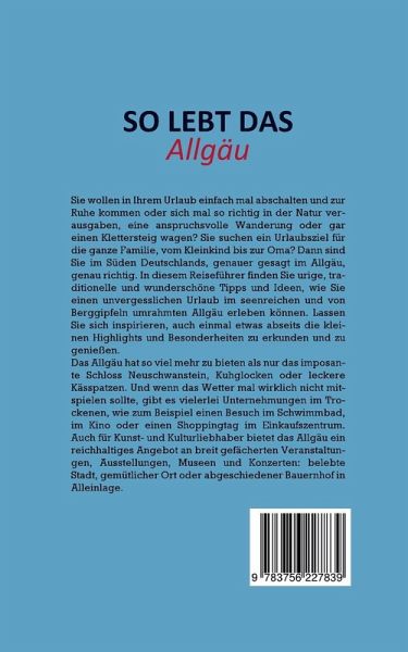 Sie wollen in Ihrem Urlaub einfach mal abschalten und zur Ruhe kommen oder sich mal so richtig in der Natur verausgaben, eine anspruchsvolle Wanderung oder gar einen Klettersteig wagen? Sie suchen ein Urlaubsziel für die ganze Familie, vom Kleinkind bis zur Oma? Dann sind Sie im Süden Deutschlands, genauer gesagt im Allgäu, genau richtig. In diesem Reiseführer finden Sie urige, traditionelle und wunderschöne Tipps und Ideen, wie Sie einen unvergesslichen Urlaub im seenreichen und von Berggipfeln umrahmten Allgäu erleben können. Lassen Sie sich inspirieren, auch einmal etwas abseits die kleinen Highlights und Besonderheiten zu erkunden und zu genießen. Das Allgäu hat so viel mehr zu bieten als nur das imposante Schloss Neuschwanstein, Kuhglocken oder leckere Kässpatzen. Und wenn das Wetter mal wirklich nicht mitspielen sollte, gibt es vielerlei Unternehmungen im Trockenen, wie zum Beispiel einen Besuch im Schwimmbad, im Kino oder einen Shoppingtag im Einkaufszentrum. Auch für Kunst- und Kulturliebhaber bietet das Allgäu ein reichhaltiges Angebot an breit gefächerten Veranstaltungen, Ausstellungen, Museen und Konzerten: belebte Stadt, gemütlicher Ort oder abgeschiedener Bauernhof in Alleinlage.