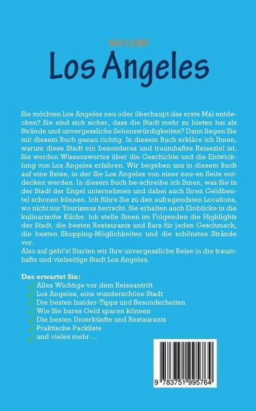 Sie möchten Los Angeles neu oder überhaupt das erste Mal entdecken? Sie sind sich sicher, dass die Stadt mehr zu bieten hat als Strände und unvergessliche Sehenswürdigkeiten? Dann liegen Sie mit diesem Buch genau richtig. In diesem Buch erkläre ich Ihnen, warum diese Stadt ein besonderes und traumhaftes Reiseziel ist. Sie werden Wissenswertes über die Geschichte und die Entwicklung von Los Angeles erfahren. Wir begeben uns in diesem Buch auf eine Reise, in der Sie Los Angeles von einer neuen Seite entdecken werden. In diesem Buch beschreibe ich Ihnen, was Sie in der Stadt der Engel unternehmen und dabei auch Ihren Geldbeutel schonen können. Ich führe Sie zu den aufregendsten Locations, wo nicht nur Tourismus herrscht. Sie erhalten auch Einblicke in die kulinarische Küche. Ich stelle Ihnen im Folgenden die Highlights der Stadt, die besten Restaurants und Bars für jeden Geschmack, die besten Shopping-Möglichkeiten und die schönsten Strände vor.Also auf geht's! Starten wir Ihre unvergessliche Reise in die traumhafte und vielseitige Stadt Los Angeles.Das erwartet Sie:-Alles Wichtige vor dem Reiseantritt-Los Angeles, eine wunderschöne Stadt-Die besten Insider-Tipps und Besonderheiten-Wie Sie bares Geld sparen können-Die besten Unterkünfte und Restaurants-Praktische Packliste-und vieles mehr ...