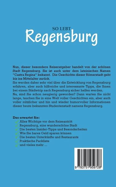 Nun, dieser besondere Reiseratgeber handelt von der schönen Stadt Regensburg. Sie ist auch unter dem lateinischen Namen ,,Castra Regina'' bekannt. Die Geschichte dieser Römerstadt geht bis ins Mittelalter zurück.Sie werden daher sehr viel über die Entwicklung von Regensburg erfahren, aber auch hilfreiche und interessante Tipps, die Ihnen bei einem Städtetrip nach Regensburg sicher helfen werden.Na, sind Sie schon neugierig geworden? Dann warten Sie nicht lange, tauchen Sie in eine Welt voller Geschichten ein, aber auch voller nützlicher und hin und wieder humorvoller Informationen dieser heute bekannten Studentenstadt namens Regensburg.Das erwartet Sie:-Alles Wichtige vor dem Reiseantritt-Regensburg, eine wunderschöne Stadt-Die besten Insider-Tipps und Besonderheiten-Wie Sie bares Geld sparen können-Die besten Unterkünfte und Restaurants-Praktische Packliste-und vieles mehr ...