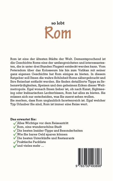 Rom ist eine der ältesten Städte der Welt. Dement-sprechend ist die Geschichte Roms eine der umfangreichsten und interessantesten, die in unter drei Stunden Flugzeit entdeckt werden kann. Vom Petersdom über das Kolosseum bis hin zum Vatikan mit seiner ganz eigenen Geschichte hat Rom einiges zu bieten. In diesem Ratgeber soll Ihnen die wahre Schönheit Roms nähergebracht und Ihre Reiselust entfacht werden. Sie finden detaillierte Tipps zu Sehenswürdigkeiten, Speisen und den geheimen Ecken dieser Weltmetropole. Egal wonach Ihnen lieber ist, ob nach Kunst, Sightseeing oder kulinarischen Leckerbissen, Rom hat alles zu bieten. Sie müssen sich nur entscheiden, was Sie zuerst sehen wollen. Sie merken, dass Rom unglaublich facettenreich ist. Egal welcher Typ Urlauber Sie sind, Rom ist immer eine Reise wert.Das erwartet Sie:-Alles Wichtige vor dem Reiseantritt-Rom, eine wunderschöne Stadt-Die besten Insider-Tipps und Besonderheiten-Wie Sie bares Geld sparen können-Die besten Unterkünfte und Restaurants-Praktische Packliste-und vieles mehr ...