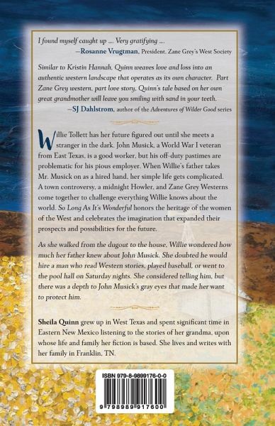 Willie Tollett has her future figured out until she meets a stranger in the dark. John Musick, a World War I veteran from East Texas, is a good worker, but his off-duty pastimes are problematic for his pious employer. When Willie's father takes Mr. Musick on as a hired hand, her simple life gets complicated. A town controversy, a midnight Howler, and Zane Grey Westerns come together to challenge everything Willie knows about the world. So Long As It's Wonderful honors the heritage of the women of the West and celebrates the imagination that expanded their prospects and possibilities for the future. As she walked from the dugout to the house, Willie wondered how much her father knew about John Musick. She doubted he would hire a man who read Western stories, played baseball, or went to the pool hall on Saturday nights. She considered telling him, but there was a depth to John Musick's gray eyes that made her want to protect him. ¿Sheila Quinn grew up in West Texas and spent significant time in Eastern New Mexico listening to the stories of her grandma, upon whose life and family her fiction is based. She lives and writes with her family in Franklin, TN. So Long As It's Wonderful releases February 29, 2024. For more information, visit sheilaquinn.com.