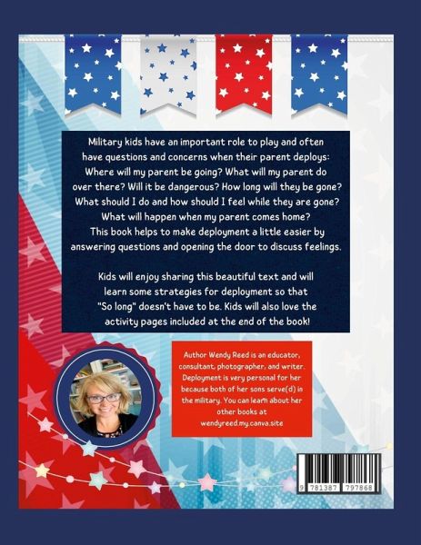 Military kids have an important role to play and often have questions and concerns when their parent deploys: Where will my parent be going? What will my parent do over there? Will it be dangerous? How long will they be gone? What should I do and how should I feel while they are gone? What will happen when my parent comes home? This book helps to make deployment a little easier by answering questions and opening the door to discuss feelings. Children will enjoy sharing this delightfully illustrated text and will learn some strategies for deployment so that "So long" doesn't have to be. Kids will also love the activity pages included at the end of the book! Recommended for children ages 4-12
