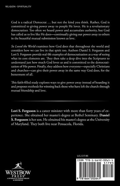 God is a radical Democrat ... but not the kind you think. Rather, God is committed to giving power away to people He loves. He is a revolutionary democratizer. Too often we hoard power and accumulate authority, but God has called us to live like He does-continually giving our power away to others in the beautiful mutual submission known as love. So Loved the World examines how God does that throughout the world and considers how we can live in that spirit too. Authors Daniel S. Ferguson and Lori S. Ferguson provide real-life examples of democratization as a way of seeing what its core elements are. They then take a deep dive into the Scriptures to understand just how much God loves us and is committed to the democratization of His power. Finally, they address how everyone-especially Christians and churches-can give their power away in the same way God does, for the betterment of all. This faith-filled study explores ways to give power away instead of hoarding it and proposes methods for winning back those who have left the church through mutual friendship and love.