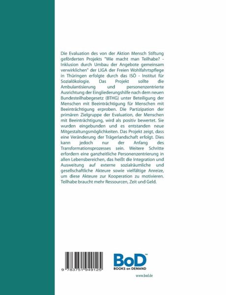 Die Evaluation des von der Aktion Mensch Stiftung geförderten Projekts "Wie macht man Teilhabe? - Inklusion durch Umbau der Angebote gemeinsam verwirklichen" der LIGA der Freien Wohlfahrtspflege in Thüringen erfolgte durch das ISÖ - Institut für Sozialökologie. Das Projekt sollte die Ambulantisierung und personenzentrierte Ausrichtung der Eingliederungshilfe nach dem neuen Bundesteilhabegesetz (BTHG) unter Beteiligung der Menschen mit Beeinträchtigung für Menschen mit Beeinträchtigung erproben. Die Partizipation der primären Zielgruppe der Evaluation, der Menschen mit Beeinträchtigung, wird als positiv bewertet. Sie wurden eingebunden und es entstanden neue Mitgestaltungsmöglichkeiten. Das Projekt zeigt, dass eine Veränderung der Trägerlandschaft erfolgt. Dies kann jedoch nur der Anfang des Transformationsprozesses sein. Weitere Schritte erfordern eine ganzheitliche Personenzentrierung in allen Lebensbereichen, das heißt die Integration und Ausweitung auf externe sozialräumliche und gesellschaftliche Akteure sowie vielfältige Anreize, um diese Akteure zur Kooperation zu motivieren. Teilhabe braucht mehr Ressourcen, Zeit und Geld.