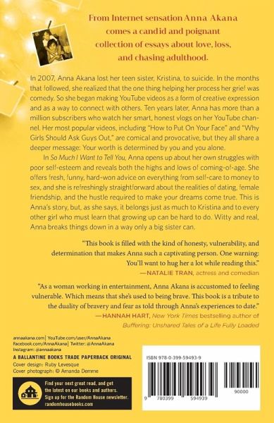 From Internet sensation Anna Akana comes a candid and poignant collection of essays about love, loss, and chasing adulthood. In 2007, Anna Akana lost her teen sister, Kristina, to suicide. In the months that followed, she realized that the one thing helping her process her grief and begin to heal was comedy. So she began making YouTube videos as a form of creative expression and as a way to connect with others. Ten years later, Anna has more than a million subscribers who watch her smart, honest vlogs on her YouTube channel. Her most popular videos, including "How to Put On Your Face" and "Why Girls Should Ask Guys Out," are comical and provocative, but they all share a deeper message: Your worth is determined by you and you alone. You must learn to love yourself. In So Much I Want to Tell You, Anna opens up about her own struggles with poor self-esteem and reveals both the highs and lows of coming-of-age. She offers fresh, funny, hard-won advice for young women on everything from self-care to money to sex, and she is refreshingly straightforward about the realities of dating, female friendship, and the hustle required to make your dreams come true. This is Anna's story, but, as she says, it belongs just as much to Kristina and to every other girl who must learn that growing up can be hard to do. Witty and real, Anna breaks things down in a way only a big sister can. Praise for So Much I Want to Tell You "This book is filled with the kind of honesty, vulnerability, and determination that makes Anna such a captivating person. One warning: You'll want to hug her a lot while reading this."-Natalie Tran, actress and comedian "As a woman working in entertainment, Anna Akana is accustomed to feeling vulnerable. Which means that she's used to being brave. This book is a tribute to the duality of bravery and fear as told through Anna's experiences to date."-Hannah Hart, New York Times bestselling author of Buffering: Unshared Tales of a Life Fully Loaded "Frank advice on how to live a productive, happy life . . . written in tribute to a 'fearless, talented, and bold' sister."-Kirkus Reviews
