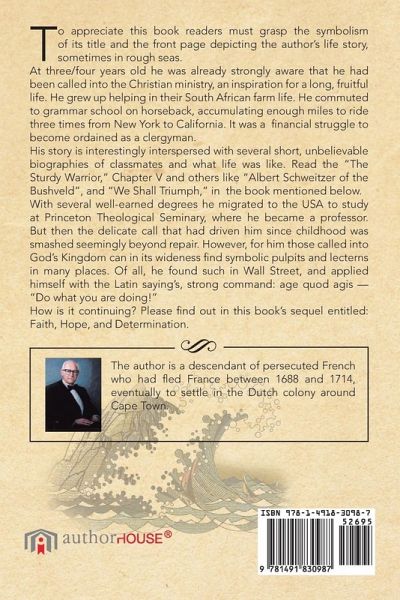To appreciate this book readers must grasp the symbolism of its title and front page depicting the author's life story, sometimes in rough seas. At three/four years old he was strongly aware of a call into the Christian ministry, inspiration for a long, fruitful life - growing up and helping on their South African farm, commuting to grammar school on horseback - together enough miles to ride three times from New York to California; struggling financially to become a clergyman. His autobiography is interspersed with short unbelieveable biographies of several classmates and what life was like. Read "The Sturdy Warrior" (Chapter V) and "Albert Schweitzer of the Bush Veld" Chapter X. With several appropriate degrees he migrated to Princeton Theological Seminary, United States of America, and became a learned professor. But then the delicate call that had driven him since a small boy was smashed beyond repair. Versility enabled him to commute to Wall Street for a new career, finding that nobody can smash a genuine call to those designated to belong to God's universal Kingdom. Symbolic pulpits and lecturns are hidden everywhere. He sought, find, and applied them with the eagerness of the Roman saying age quod agis - "do what you are doing." How did it go? Please find the sequel to this book FAITH, HOPE, AND DETERMINATION and read it.