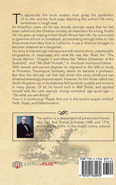 To appreciate this book readers must grasp the symbolism of its title and front page depicting the author's life story, sometimes in rough seas. At three/four years old he was strongly aware of a call into the Christian ministry, inspiration for a long, fruitful life - growing up and helping on their South African farm, commuting to grammar school on horseback - together enough miles to ride three times from New York to California; struggling financially to become a clergyman. His autobiography is interspersed with short unbelieveable biographies of several classmates and what life was like. Read "The Sturdy Warrior" (Chapter V) and "Albert Schweitzer of the Bush Veld" Chapter X. With several appropriate degrees he migrated to Princeton Theological Seminary, United States of America, and became a learned professor. But then the delicate call that had driven him since a small boy was smashed beyond repair. Versility enabled him to commute to Wall Street for a new career, finding that nobody can smash a genuine call to those designated to belong to God's universal Kingdom. Symbolic pulpits and lecturns are hidden everywhere. He sought, find, and applied them with the eagerness of the Roman saying age quod agis - "do what you are doing." How did it go? Please find the sequel to this book FAITH, HOPE, AND DETERMINATION and read it.