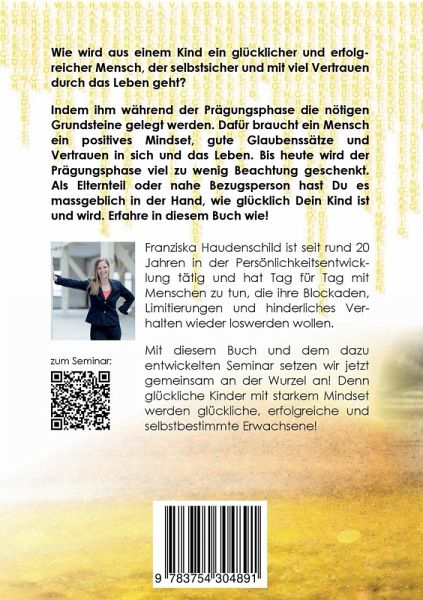 Wie wird aus einem Kind ein glücklicher, erfolgreicher Mensch, der selbstsicher und mit viel Vertrauen durch das Leben geht? In dem ihm während der Prägungsphase die nötigen Grundsteine gelegt werden. Dafür braucht ein Mensch ein positives Mindset, gute Glaubenssätze und Vertrauen in sich und das Leben. Bis heute wird der Prägungsphase viel zu wenig Beachtung geschenkt. Als Elternteil oder nahe Bezugsperson hast Du es massgeblich in der Hand, wie glücklich Dein Kind ist und wird. Erfahre in diesem Buch wie!