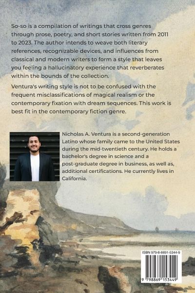 So-so is a compilation of writings that cross genres through prose, poetry, and short stories. The author intends to weave both classical thematic elements, literary devices, and influences from classical and modern writers to form a style that leaves you feeling a hallucinatory experience that reverberates within the bounds of the collection. This compilation includes writings from 2011 to 2023 from which nearly half of the writings between 2011 and 2018 were not included and are no longer with us. It is a deeply personal beacon for those interested in a deconstruction of literary composition.