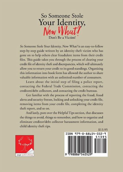 So Someone Stole Your Identity, Now What? is an easy-to-follow step-by-step guide written by an identity theft victim who has gone on to help others clear fraudulent items from their credit files. This guide takes you through the process of clearing your credit file of identity theft and discrepancies, which will ultimately allow you to return your credit to its good standings. Organizing this information into book form has allowed the author to share valuable information with an unlimited number of consumers. Learn about the initial step of filing a police report, contacting the Federal Trade Commission, contacting the creditors/debt collectors, and contacting the credit bureaus. Get familiar with the process of reporting the fraud, fraud alerts and security freezes, locking and unlocking your credit file, removing items from your credit file, completing the identity theft report, and so on. And lastly, pore over the Helpful Tips section, that discusses the things to avoid, things to remember, and how to organize and eliminate creditor/debt collector harassment information, and child identity theft tips.