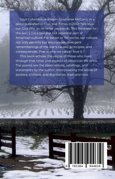 Says Columbia professor Stephanie McCurry in a piece published in Civil War Times in 2012: "We love our Civil War as no other people do. This fondness for the war, [...] is a peculiar but essential part of American culture. For better or for worse, our culture not only permits but encourages divergent rememberings of the war's causes, principles, and consequences. That is why we can all love it..." This book echoes the voices of those who lived through that time, and aspects of American life since. The poems are the observations, retellings, and statements by the author, incorporating the words of soldiers, civilians, and dignitaries, then and now.