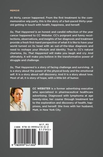 At thirty, cancer happened. From the first treatment to the commemorative wig party, this is the story of a fast-paced thirty-year-old getting in touch with health, happiness, and herself. So, That Happened is an honest and candid reflection of the year cancer happened. CC Webster’s poignant recollections, observations, and insights throughout her diagnosis and treatment provide a fresh first-hand perspective of what it is like to have your world turned on its head with one out-of-the-blue diagnosis and to transform out of the rubble. True to CC's natural charisma, So, That Happened will make you laugh and cry. And ultimately, it will make you believe in the transformative power of struggle and challenge. So, That Happened is a story of facing challenge and surviving. It is a story about the power of the physical body and the emotional self. It is a story about self-discovery. And it is a story about love. Most of all, it is story of hope, with a little bit of humor.
