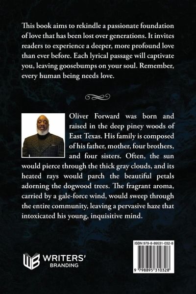 Synopsis: This book aims to rekindle a passionate foundation of love that has been lost over generations. It invites readers to experience a deeper, more profound love than ever before. Each lyrical passage will captivate you, leaving goosebumps on your soul. Remember, every human being needs love. Autobiography: Oliver Forward was born and raised in the deep piney woods of East Texas. His family is composed of his father, mother, four brothers, and four sisters. Often, the sun would pierce through the thick gray clouds, and its heated rays would parch the beautiful petals adorning the dogwood trees. The fragrant aroma, carried by a gale-force wind, would sweep through the entire community, leaving a pervasive haze that intoxicated his young, inquisitive mind.