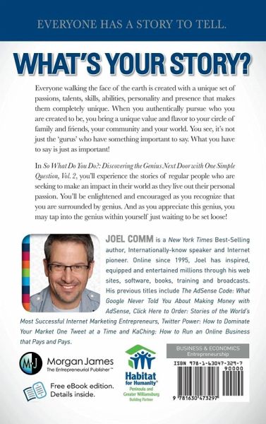 Every person has been created by God with a set of unique passions, talents, skills, abilities, personality and presence which makes them completely unique from anyone who has ever, or will ever, live. When you are doing what you were made to do, you have the opportunity to positively impact the people and world around you. Unlike many books which highlight the "gurus", "So What Do You Do? Discovering the Genius Next Door with One Simple Question" puts the spotlight on the unsung heroes; the everyday person; your neighbor; each of which has a special expertise which is demonstrated in their vocation or hobby. From exceptional parenting and exciting adventure travel to growing a thriving business and dealing with issues of personal growth, "So What Do YOU Do?" will take you to new places and inspire you to share your genius with the world.