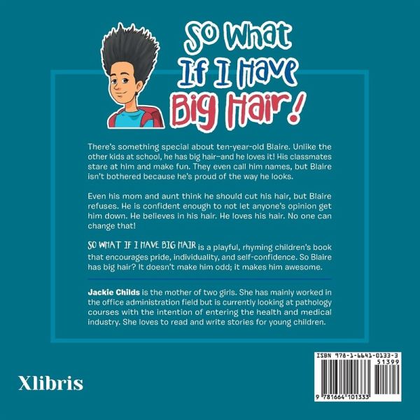 There's something special about ten-year-old Blaire. Unlike the other kids at school, he has big hair-and he loves it! His classmates stare at him and make fun. They even call him names, but Blaire isn't bothered because he's proud of the way he looks. Even his mom and aunt think he should cut his hair, but Blaire refuses. He is confident enough to not let anyone's opinion get him down. He believes in his hair. He loves his hair. No one can change that! So What If I Have Big Hair is a playful, rhyming children's book that encourages pride, individuality, and self-confidence. So Blaire has big hair? It doesn't make him odd; it makes him awesome.