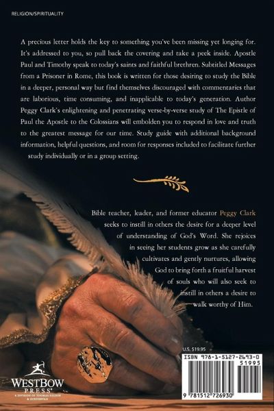 A precious letter holds the key to something you've been missing yet longing for. It's addressed to you, so pull back the covering and take a peek inside. Apostle Paul and Timothy speak to today's saints and faithful brethren. Subtitled Messages from a Prisoner in Rome, this book is written for those desiring to study the Bible in a deeper, personal way but find themselves discouraged with commentaries that are laborious, time consuming, and inapplicable to today's generation. Author Peggy Clark's enlightening and penetrating verse-by-verse study of The Epistle of Paul the Apostle to the Colossians will embolden you to respond in love and truth to the greatest message for our time. Study guide with additional background information, helpful questions, and room for responses included to facilitate further study individually or in a group setting.