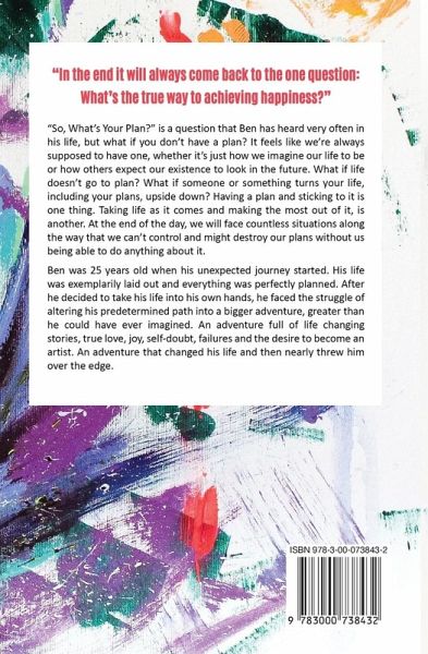 "In the end it will always come back to the one question: What's the true way to achieving happiness?" "So, What's Your Plan?" is a question that Ben has heard very often in his life, but what if you don't have a plan? It feels like we're always supposed to have one, whether it's just how we imagine our life to be or how others expect our existence to look in the future. What if life doesn't go to plan? What if someone or something turns your life, including your plans, upside down? Having a plan and sticking to it is one thing. Taking life as it comes and making the most out of it, is another. At the end of the day, we will face countless situations along the way that we can't control and might destroy our plans without us being able to do anything about it. Ben was 25 years old when his unexpected journey started. His life was exemplarily laid out and everything was perfectly planned. After he decided to take his life into his own hands, he faced the struggle of altering his predetermined path into a bigger adventure, greater than he could have ever imagined. An adventure full of life changing stories, true love, joy, self-doubt, failures and the desire to become an artist. An adventure that changed his life and then nearly threw him over the edge.