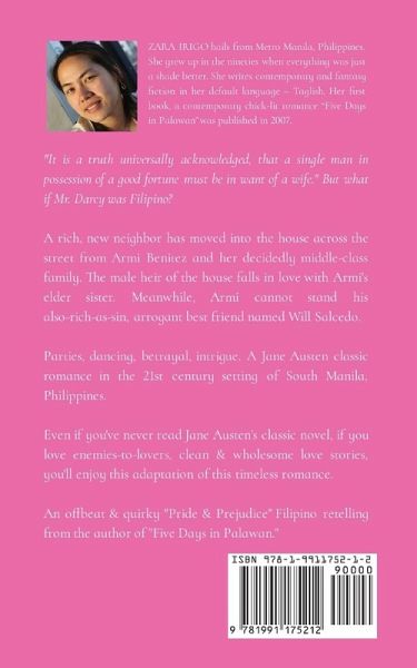 "It is a truth universally acknowledged, that a single man in possession of a good fortune must be in want of a wife." But what if Mr. Darcy was Filipino? A rich, new neighbor has moved into the house across the street from Armi Benitez and her decidedly middle-class family. The male heir of the house falls in love with Armi's elder sister. Meanwhile, Armi cannot stand his also-rich-as-sin, arrogant best friend named Will Salcedo. Parties, dancing, betrayal, intrigue. A Jane Austen classic romance in the 21st century setting of South Manila, Philippines. Even if you've never read Jane Austen's classic novel, if you love enemies-to-lovers, clean & wholesome love stories, you'll enjoy this adaptation of this timeless romance. An offbeat & quirky "Pride & Prejudice" Filipino retelling from the author of "Five Days in Palawan."
