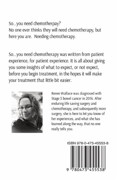 So...you need chemotherapy? No one ever thinks they will need chemotherapy, but here you are. Needing chemotherapy. So...you need chemotherapy is written from patient experience, for patient experience. It is all about giving you some insights of what to expect, or not expect, before you begin treatment, in the hopes it will make your treatment that little bit easier. Renee Wallace was diagnosed with stage 3 bowel cancer in 2016. After enduring life saving surgery and chemotherapy, and subsequently more surgery. She is here to let you know of her experiences, and what she has learned along the way, that no one really tells you.