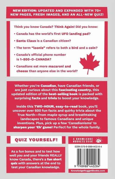 NEW EDITION - Updated and expanded with 70+ new pages, fresh images, and an all-new quiz. Think you know Canada? Think Again! Did you know: - Canada has the world's first UFO landing pad? - Santa Claus is a Canadian citizen? - The term "loonie" refers to both a bird and a coin? - Canada's official phone number is 1-800-O-CANADA? - Canadians eat more macaroni and cheese than anyone else in the world? Whether you're Canadian, have Canadian friends, or are just curious about this fascinating country, this updated edition of the best-selling book is packed with surprising facts and trivia to boost your knowledge. Inside this TWO-HOUR, easy-to-read book, you'll uncover over 600 fun facts and quirky trivia about the True North-from maple syrup and breathtaking landscapes to famous Canadians and unique inventions. Plus, pick up a few 'Canadianisms' to sharpen your 'Eh' game! Perfect for the whole family. Quiz Yourself! As a fun bonus and to test how well you and your friends REALLY know Canada, there's a fun short quiz with answers at the end to test your Canadian knowledge.