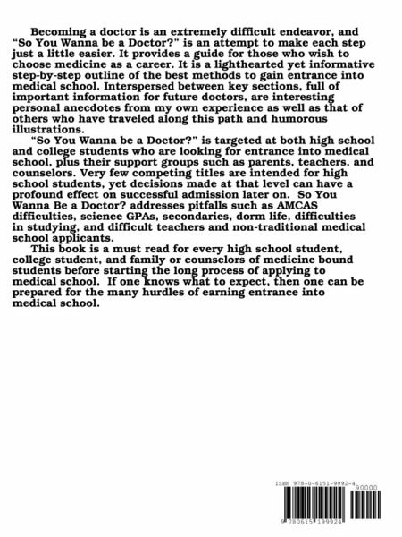 Becoming a doctor is an extremely difficult endeavor, and "So You Wanna be a Doctor?" is an attempt to make each step just a little easier. It provides a guide for those who wish to choose medicine as a career. It is a lighthearted yet informative step-by-step outline of the best methods to gain entrance into medical school. Interspersed between key sections, full of important information for future doctors, are interesting personal anecdotes from my own experience as well as that of others who have traveled along this path and humorous illustrations.