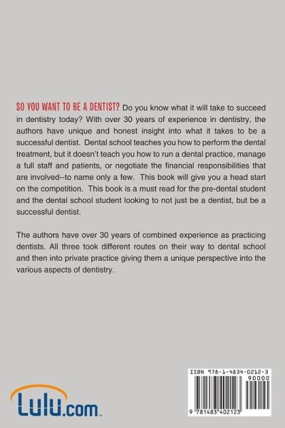 So you want to be a dentist? Do you know what it will take to succeed in dentistry today? With over 30 years of experience in dentistry, the authors have unique and honest insight into what it takes to be a successful dentist. Dental school teaches you how to perform the dental treatment, but it doesn't teach you how to run a dental practice, manage a full staff and patients, or negotiate the financial responsibilities that are involved--to name only a few. This book will give you a head start on the competition. This book is a must read for the pre-dental student and the dental school student looking to not just be a dentist, but be a successful dentist. The authors have over 30 years of combined experience as practicing dentists. All three took different routes on their way to dental school and then into private practice giving them a unique perspective into the various aspects of dentistry.