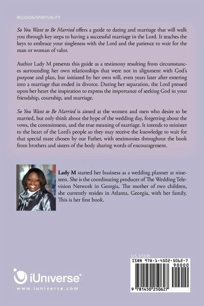 So You Want to Be Married offers a guide to dating and marriage that will walk you through key steps to having a successful marriage in the Lord. It teaches the keys to embrace your singleness with the Lord and the patience to wait for the man or woman of valor. Author Lady M presents this guide as a testimony resulting from circumstances surrounding her own relationships that were not in alignment with God's purpose and plan, but initiated by her own will, even years later after entering into a marriage that ended in divorce. During her separation, the Lord pressed upon her heart the inspiration to express the importance of seeking God in your friendship, courtship, and marriage. So You Want to Be Married is aimed at the women and men who desire to be married, but only think about the hype of the wedding day, forgetting about the vows, the commitment, and the true meaning of marriage. It intends to minister to the heart of the Lord's people so they may receive the knowledge to wait for that special mate chosen by our Father, with testimonies throughout the book from brothers and sisters of the body sharing words of encouragement.