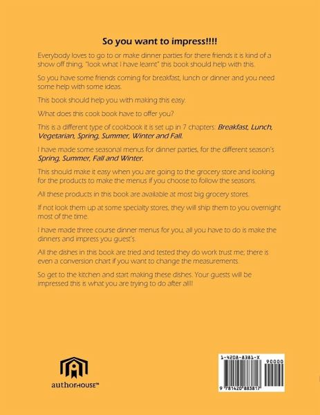 So you want to impress!! Everybody loves to go to or make dinner parties for there friends it is kind of a show off thing, "look what I have learnt" this book should help with this So you have some friends coming for breakfast, lunch or dinner and you need some help with some ideas. This book should help you with making this easy. What does this cook book have to offer you? This is a different type of cookbook it is set up in 7 chapters Breakfast, Lunch, Vegetarian, Spring, Summer, Winter and Fall I have made some seasonal menus for dinner parties, for the different season's Spring, Summer, Fall and Winter. This should make it easy when you are going to the grocery store and looking for the products to make the menus if you choose to follow the seasons. All these products in this book are available at most big grocery stores. If not look them up at some specialty stores, they will ship them to you overnight most of the time. I have made three course dinner menus for you, all you have to do is make the dinners and impress you guest's. All the dishes in this book are tried and tested they do work trust me; there is even a conversion chart if you want to change the measurements. So get to the kitchen and start making these dishes. Your guests will be impressed this is what you are trying to do after all!!