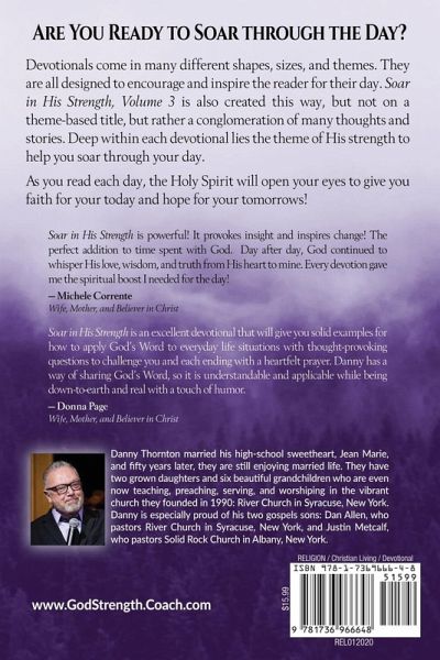 Are you ready to soar through the day? Devotionals come in many different shapes, sizes, and themes. They are all designed to encourage and inspire the reader for their day. Soar in His Strength, Volume 3 is also created this way, but not on a theme-based title, but rather a conglomeration of many thoughts and stories. Deep within each devotional lies the theme of His strength to help you soar through your day. As you read each day, the Holy Spirit will open your eyes to give you faith for your today and hope for your tomorrows!