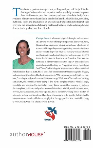 This book is part memoir, part storytelling, and part self-help. It is the sharing of information and experiences that may help others to improve their health status, treat their patients, and even raise their family. It is a synthesis of many research articles in the field of health, rehabilitation, medicine, nutrition, sleep, and much more in a useable and understandable format that everyone can understand. Achieving health and wellness while reducing chronic disease is the goal of Soar Into Health.