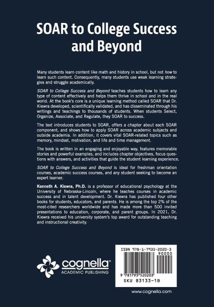 Many students learn content like math and history in school, but not how to learn such content. Consequently, many students use weak learning strategies and struggle academically. SOAR to College Success and Beyond teaches students how to learn any type of content effectively and helps them thrive in school and in the real world. At the book's core is a unique learning method called SOAR that Dr. Kiewra developed, scientifically validated, and has disseminated through his writings and teachings to thousands of students. When students Select, Organize, Associate, and Regulate, they SOAR to success. The text introduces students to SOAR, offers a chapter about each SOAR component, and shows how to apply SOAR across academic subjects and outside academia. In addition, it covers vital SOAR-related topics such as memory, mindset, motivation, and life and time management. The book is written in an engaging and enjoyable way, features memorable stories and powerful examples, and includes chapter objectives, focus questions with answers, and activities that guide the student learning experience. SOAR to College Success and Beyond is ideal for freshman orientation courses, academic success courses, and any student seeks to become an expert learner.