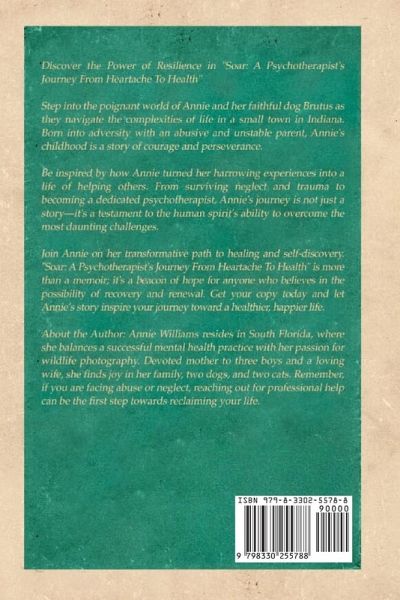 Discover the Power of Resilience in "Soar: A Psychotherapist's Journey From Heartache To Health" Step into the poignant world of Annie and her faithful dog Brutus as they navigate the complexities of life in a small town in Indiana. Born into adversity with an abusive and unstable parent, Annie's childhood is a story of courage and perseverance. Be inspired by how Annie turned her harrowing experiences into a life of helping others. From surviving neglect and trauma to becoming a dedicated psychotherapist, Annie's journey is not just a story-it's a testament to the human spirit's ability to overcome the most daunting challenges. Join Annie on her transformative path to healing and self-discovery. "Soar: A Psychotherapist's Journey From Heartache To Health" is more than a memoir; it's a beacon of hope for anyone who believes in the possibility of recovery and renewal. Get your copy today and let Annie's story inspire your journey toward a healthier, happier life. About the Author: Annie Williams resides in South Florida, where she balances a successful mental health practice with her passion for wildlife photography. Devoted mother to three boys and a loving wife, she finds joy in her family, two dogs, and two cats. Remember, if you are facing abuse or neglect, reaching out for professional help can be the first step towards reclaiming your life.