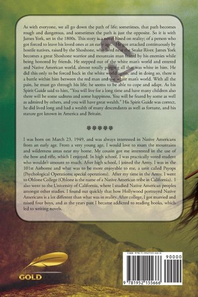 As with everyone, we all go down the path of life; sometimes, that path becomes rough and dangerous, and sometimes the path is just the opposite. So it is with James York, set in the 1800s. This story is a novel based on reality; of a person who got forced to leave his loved ones at an early age. He got attacked continuously by hostile natives, raised by the Shoshone, who lived near the Snake River. James York becomes a great Shoshone warrior and mountain man feared by his enemies while being honored by friends. He stepped out of the white man's world and entered and Native American world, almost totally purging all that was white in him. He did this only to be forced back in the white world again, and in doing so, there is a battle within him between the red man and the white man's world. With all the pain, he must go through his life; he seems to be able to cope and adapt. As his Spirit Guide said to him, "You will live for a long time and have many children also there will be some sadness and some happiness. You will be feared by some as well as admired by others, and you will have great wealth." His Spirit Guide was correct, he did lived long and had a wealth of many descendants as well as fortune, and his stature got known in America and Britain.