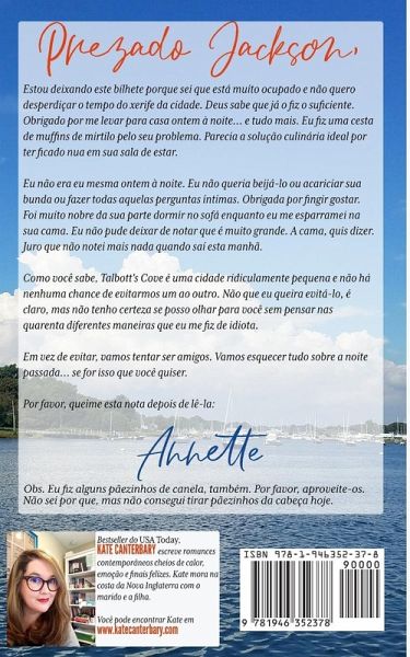 Prezado Jackson, Estou deixando este bilhete porque sei que está muito ocupado e não quero desperdiçar o tempo do xerife da cidade. Deus sabe que já o fiz o suficiente. Obrigado por me levar para casa ontem à noite... e tudo mais. Eu fiz uma cesta de muffins de mirtilo pelo seu problema. Parecia a solução culinária ideal por ter ficado nua em sua sala de estar. Eu não era eu mesma ontem à noite. Eu não queria beijá-lo ou acariciar sua bunda ou fazer todas aquelas perguntas íntimas. Obrigada por fingir gostar. Foi muito nobre da sua parte dormir no sofá enquanto eu me esparramei na sua cama. Eu não pude deixar de notar que é muito grande. A cama, quis dizer. Juro que não notei mais nada quando saí esta manhã. Como você sabe, Talbott's Cove é uma cidade ridiculamente pequena e não há nenhuma chance de evitarmos um ao outro. Não que eu queira evitá-lo, é claro, mas não tenho certeza se posso olhar para você sem pensar nas quarenta diferentes maneiras que eu me fiz de idiota. Em vez de evitar, vamos tentar ser amigos. Vamos esquecer tudo sobre a noite passada... se for isso que você quiser. Por favor, queime esta nota depois de lê-la: Annette Obs. Eu fiz alguns pãezinhos de canela, também. Por favor, aproveite-os. Não sei por que, mas não consegui tirar pãezinhos da cabeça hoje.