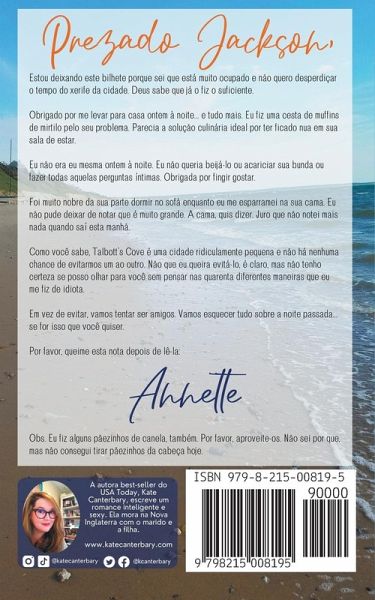 Prezado Jackson, Estou deixando este bilhete porque sei que está muito ocupado e não quero desperdiçar o tempo do xerife da cidade. Deus sabe que já o fiz o suficiente. Obrigado por me levar para casa ontem à noite... e tudo mais. Eu fiz uma cesta de muffins de mirtilo pelo seu problema. Parecia a solução culinária ideal por ter ficado nua em sua sala de estar. Eu não era eu mesma ontem à noite. Eu não queria beijá-lo ou acariciar sua bunda ou fazer todas aquelas perguntas íntimas. Obrigada por fingir gostar. Foi muito nobre da sua parte dormir no sofá enquanto eu me esparramei na sua cama. Eu não pude deixar de notar que é muito grande. A cama, quis dizer. Juro que não notei mais nada quando saí esta manhã. Como você sabe, Talbott's Cove é uma cidade ridiculamente pequena e não há nenhuma chance de evitarmos um ao outro. Não que eu queira evitá-lo, é claro, mas não tenho certeza se posso olhar para você sem pensar nas quarenta diferentes maneiras que eu me fiz de idiota. Em vez de evitar, vamos tentar ser amigos. Vamos esquecer tudo sobre a noite passada... se for isso que você quiser. Por favor, queime esta nota depois de lê-la: Annette Obs. Eu fiz alguns pãezinhos de canela, também. Por favor, aproveite-os. Não sei por que, mas não consegui tirar pãezinhos da cabeça hoje.