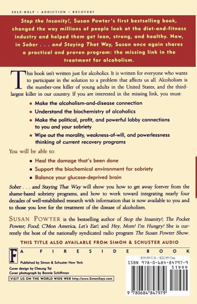 Stop the Insanity!, Susan Powter's first bestselling book, changed the way millions of people look at the diet-and-fitness industry and helped them get lean, strong, and healthy. Now, in Sober . . . and Staying That Way, Susan once again shares a practical and proven program: the missing link in the treatment for alcoholism. This book isn't written just for alcoholics. It is written for everyone who wants to participate in the solution to a problem that affects us all. Alcoholism is the number-one killer of young adults in the United States, and the third-largest killer in our country. If you are interested in the missing link, you must: -- Make the alcoholism-and-disease connection -- Understand the biochemistry of alcoholics -- Make the political, profit, and powerful lobby connections to you and your sobriety -- Wipe out the morality, weakness-of-will, and powerlessness thinking of current recovery programs You will be able to: -- Heal the damage that's been done -- Support the biochemical environment for sobriety -- Balance your glucose-deprived brain Sober . . . and Staying That Way will show you how to get away forever from the shame-based sobriety programs, and how to work toward integrating nearly four decades of well-established research with information that is now available to you and to those you love for the treatment of the disease of alcoholism.