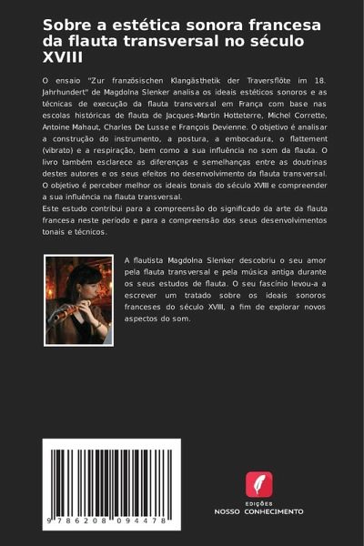 O ensaio "Zur französischen Klangästhetik der Traversflöte im 18. Jahrhundert" de Magdolna Slenker analisa os ideais estéticos sonoros e as técnicas de execução da flauta transversal em França com base nas escolas históricas de flauta de Jacques-Martin Hotteterre, Michel Corrette, Antoine Mahaut, Charles De Lusse e François Devienne. O objetivo é analisar a construção do instrumento, a postura, a embocadura, o flattement (vibrato) e a respiração, bem como a sua influência no som da flauta. O livro também esclarece as diferenças e semelhanças entre as doutrinas destes autores e os seus efeitos no desenvolvimento da flauta transversal. O objetivo é perceber melhor os ideais tonais do século XVIII e compreender a sua influência na flauta transversal.Este estudo contribui para a compreensão do significado da arte da flauta francesa neste período e para a compreensão dos seus desenvolvimentos tonais e técnicos.