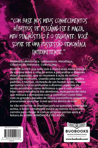 Sobre Demônios e Pecados traz uma série de ensaios de Rubem Alves abordando as semelhanças entre as supostas manifestações demoníacas com enfermidades psicológicas, além de abordar diversas superstições, traçando um paralelo entre a origem de seres folclóricos e o comportamento humano. Ainda nesta linha, Rubem Alves costura todo o raciocínio de como vivemos duas realidades, a interna, mental, e a externa, física, e a influência que uma pode exercer sobre a outra ao explorar também os pecados capitais como eles afetam nossa existência e nosso convívio em sociedade.