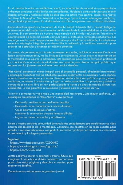¿Eres un adolescente que lucha contra el miedo, la duda o la presión y busca la manera de salir adelante? "Levántate: Diez maneras de fortalecer tu mentalidad como adolescente" es una guía poderosa, inspirada en la fe, que proporciona a los jóvenes las herramientas para desarrollar fortaleza mental, aumentar la autoestima y superar los desafíos más difíciles de la vida. Escrito por Bobby Cobb, veterano discapacitado de la Marina de los EE. UU. y sobreviviente de una lesión cerebral traumática (LCT), este libro se basa profundamente en el testimonio personal y la experiencia vivida. Tras sobrevivir a una herida de bala casi mortal en la cabeza y años de fisioterapia, Bobby desafió las probabilidades y aprendió a caminar y hablar de nuevo. Hoy, como fundador de Cobb Global Outreach Inc., usa su historia para inspirar a estudiantes de todo el país a superar la adversidad y creer en sí mismos. Este libro ofrece más que solo inspiración: proporciona un plan para el crecimiento. Cada capítulo aborda un principio crítico de la mentalidad e incluye ejercicios prácticos para ayudar a los adolescentes a desarrollar confianza, resiliencia y claridad sobre su futuro. En este libro, los adolescentes descubrirán: ¿¿ Cómo cambiar de una mentalidad fija a una mentalidad de crecimiento ¿¿ Estrategias para superar el miedo, el fracaso y la inseguridad ¿¿ Herramientas para establecer metas significativas y mantener el compromiso con ellas ¿¿ Cómo bloquear las influencias negativas y proteger su paz ¿¿ El poder de la fe, la disciplina y la responsabilidad personal ¿¿ Historias reales de perseverancia y de cómo convertir el dolor en propósito ¿¿ Hábitos y afirmaciones diarias que generan éxito a largo plazo Cada capítulo incluye reflexiones interactivas, sugerencias para escribir en un diario, situaciones de juego de roles y aliento bíblico. Ya sea que enfrenten desafíos en la escuela, en casa, con sus amistades o dentro de sí mismos, los lectores adquirirán un sentido de identidad, esperanza y propósito más fuerte. Para quién es este libro: Estudiantes de secundaria y preparatoria que buscan motivación y dirección Grupos juveniles y ministerios religiosos que necesitan recursos centrados en la fe Padres, educadores y mentores que desean inspirar un cambio positivo Lectores adolescentes que enfrentan problemas de salud mental, inseguridad y presión social Si alguna vez te has sentido estancado, perdido o indigno, este libro te recuerda que tu historia no ha terminado. Puedes superarte. Puedes liderar. Puedes ganar. Tu gran avance está a solo un capítulo de distancia. "Rise Above" presenta un marco integral para el desarrollo personal, ofreciendo herramientas y estrategias específicas que los estudiantes pueden implementar de inmediato. Cada capítulo aborda desafíos comunes y ofrece soluciones prácticas para desarrollar la confianza, mantener la motivación y alcanzar el éxito sostenible. Los principios y prácticas que se comparten en este libro se han perfeccionado a lo largo de años de trabajo directo con estudiantes, lo que garantiza su relevancia y eficacia para los jóvenes de hoy. Te invito a emprender tu camino hacia una mentalidad más fuerte y una mayor confianza. Las estrategias presentadas en "Rise Above" te ayudarán a: - Desarrollar resiliencia para afrontar los desafíos - Desarrollar una autoconfianza duradera - Crear sistemas de apoyo eficaces - Mantener la motivación en momentos difíciles - Alcanzar tus metas personales y académicas