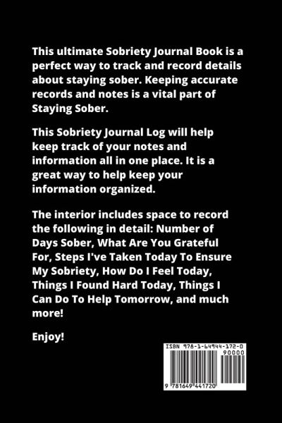 Congratulations on being clean & sober! This Sobriety Journal is a practical way to keep track of every step of your journey. Makes a great gift for men & women who are celebrating their Soberversary & recovering from substance abuse, whether it's drugs, alcohol (alcoholism) & drinking, OCD related, hoarding, etc. Each page features prompts & space to write: Day ___ Of My Journey Date/Day/Year, Number Of Days Sober What Are You Grateful For Today? Steps I've Taken Today To Ensure I Stay Sober How Do You Feel Today (1-10 Rating) Things I Found Hard Today Things I Can Do To Help Tomorrow Blank Lined Notes Did You Stay Sober Today? Perfect for anyone who wants to record their achievements, positive & fun, happy thoughts, struggles, attitude, gratitude, finding strength, funny moments, etc. Awesome alternative to a card & awesome to look back on over the years. Journals, Diaries & notebooks are a great way to keep all your important information all in one place. Size is 6x9 inches, 106 pages, soft matte finish cover, quality white paper, paperback.