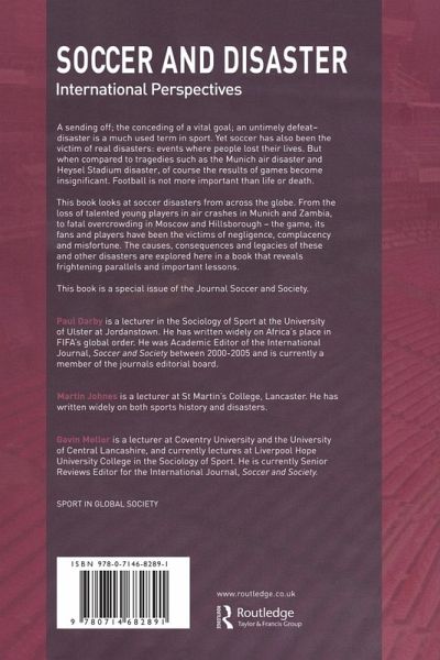 The word disaster is much used in the world of soccer - conceding a penalty, a sending off, an untimely defeat. Comparing these with real life disasters puts things into perspective and the results of the games become insignificant. Soccer is not more important than life or death! For the first time, real life tragedies in the world of soccer are explored in one volume. From the loss of life of talented young players in the Munich and Zambian air disasters to fatal overcrowding at Hillsborough and Moscow. During the history of the game, fans and players alike have been the victims of negligence, complacency and misfortune. The causes, consequences and legacies of these and other disasters are examined in this book that reveals frightening parallels and important lessons. A powerful book suitable for students of sociology, sports studies and social history. This volume was previously published as a special issue of the journal Sport in the Global Society.